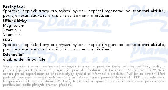 Sportovní doplněk stravy pro zvýšení výkonu, zlepšení regeneraci po sportovní aktivitě, posiluje kostní strukturu a snížit riziko zlomenin a přetížení.