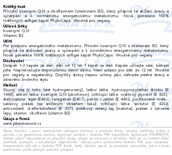 Přírodní koenzym Q10 s riboflavinem (vitaminem B2), který přispívá ke snížení únavy a vyčerpání a k normálnímu energetickému metabolizmu. Nová generace 100% rostlinných softgel kapslí PhytoCaps. Vhodné pro vegany.