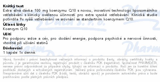Extra silná dávka 100 mg koenzymu Q10 s novou, inovativní technologií liposomálního vstřebávání s klinicky ověřenou účinností pro extra vysoké vstřebávání. Klinická studie potvrdila 9x vyšší vstřebávání ve srovnání se standartním koenzymem Q10.