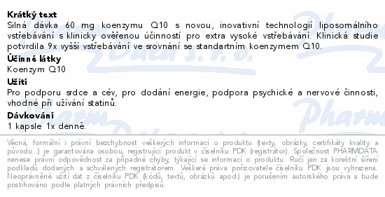 GS Koenzym Lipo Q10 je doplněk stravy s extra silným složením a unikátní technologií liposomálního vstřebávání pro 9× vyšší vstřebatelnost než běžný koenzym Q10. Obohaceno o vitamin B1 pro podporu srdce, normální energetický metabolismus, psychickou a nervovou činnost. Vhodný při užívání statinů, léků určených pro snížení hladiny cholesterolu.