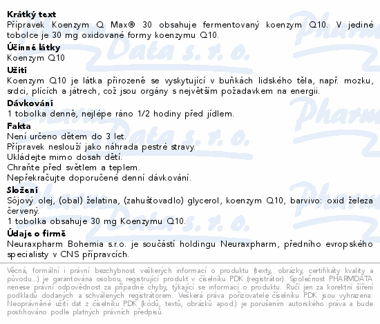Přípravek Koenzym Q Max® 30 obsahuje fermentovaný koenzym Q10. V jediné tobolce je 30 mg oxidované formy koenzymu Q10.