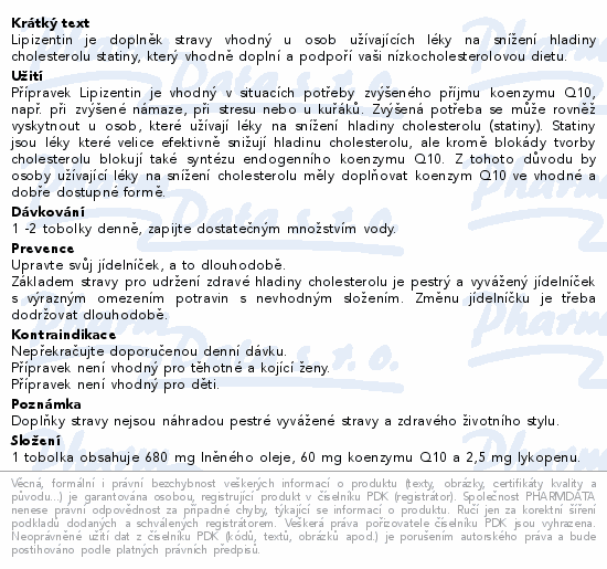 Lipizentin je zdrojem vysoce kvalitního koenzymu Q10 v dávce 60 mg/tobolku ve formě olejové suspenze s nutričně hodnotným lněným olejem, který je zdrojem pro organismus cenných nenasycených mastných kyselin (omega-3 mastných kyselin). Je speciálně navržený pro osoby užívající statiny.