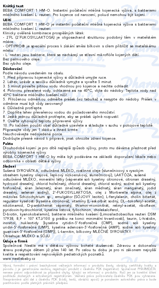 BEBA COMFORT 1 HM-O. Instantní počáteční mléčná kojenecká výživa, s bakteriemi mléčného kvašení L. reuteri. Pro kojence od narození, pokud nemohou být kojeni.