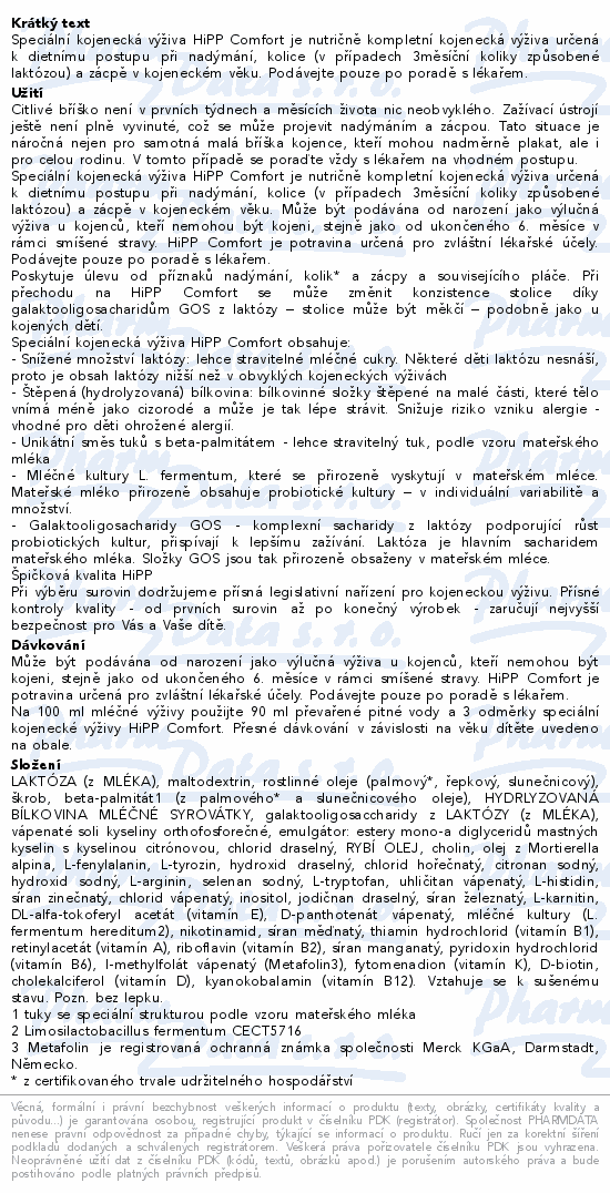 Speciální kojenecká výživa HiPP Comfort je nutričně kompletní kojenecká výživa určená k dietnímu postupu při nadýmání, kolice (v případech 3měsíční koliky způsobené laktózou) a zácpě v kojeneckém věku. Podávejte pouze po poradě s lékařem.