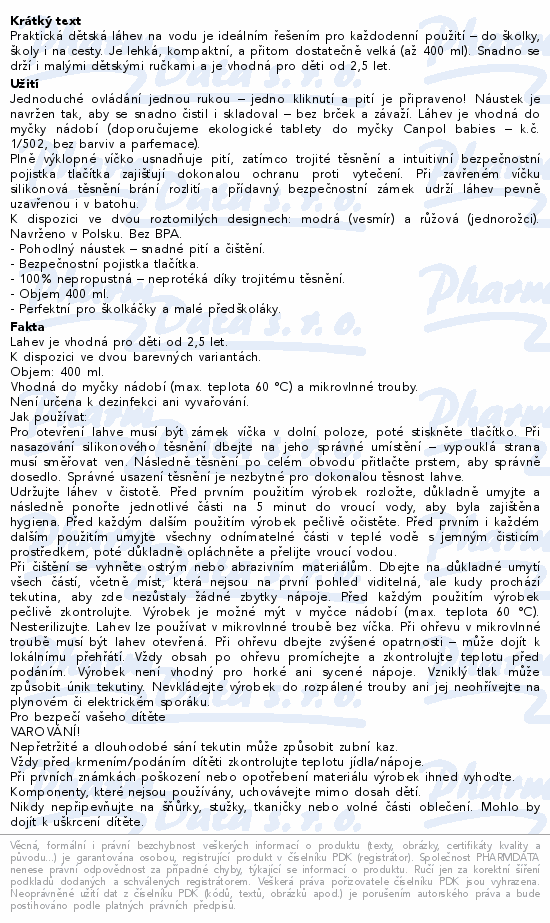 Praktická dětská láhev na vodu je ideálním řešením pro každodenní použití – do školky, školy i na cesty. Je lehká, kompaktní, a přitom dostatečně velká (až 400 ml). Snadno se drží i malými dětskými ručkami a je vhodná pro děti od 2,5 let.