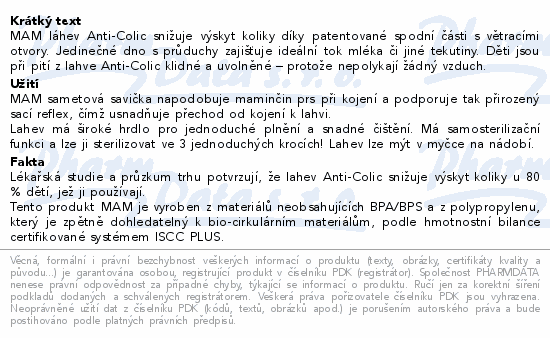 MAM láhev Anti-Colic snižuje výskyt koliky díky patentované spodní části s větracími otvory. Jedinečné dno s průduchy zajišťuje ideální tok mléka či jiné tekutiny. Děti jsou při pití z lahve Anti-Colic klidné a uvolněné – protože nepolykají žádný vzduch.