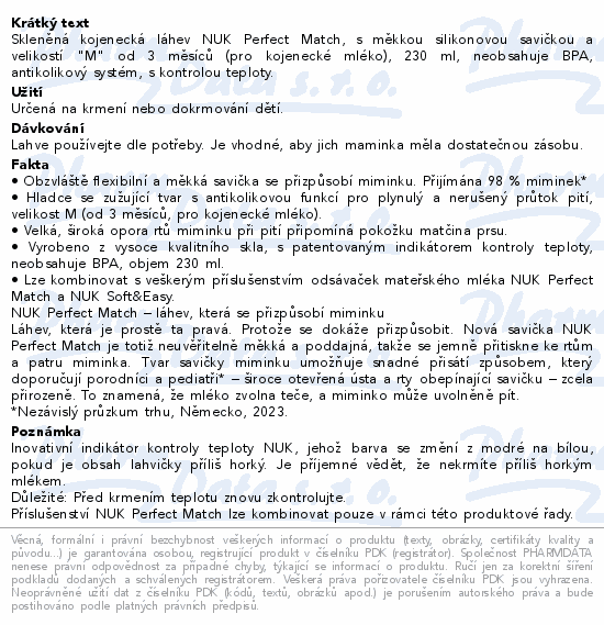 Skleněná kojenecká láhev NUK Perfect Match, s měkkou silikonovou savičkou a velikostí "M" od 3 měsíců (pro kojenecké mléko), 230 ml, neobsahuje BPA, antikolikový systém, s kontrolou teploty.