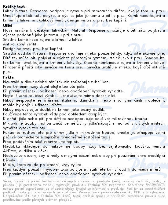 Láhev Natural Response podporuje rytmus pití samotného dítěte, jako je tomu u prsu. Umožňuje dítěti sát, polykat a dýchat jako je tomu u pití z prsu. Kombinace kojení a krmení z láhve, antikolikový ventil, design ve tvaru prsu bez kapání.