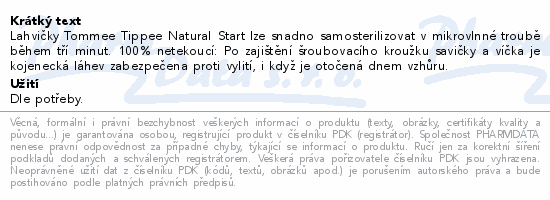 Lahvičky Tommee Tippee Natural Start lze snadno samosterilizovat v mikrovlnné troubě během tří minut. 100% netekoucí: Po zajištění šroubovacího kroužku savičky a víčka je kojenecká láhev zabezpečena proti vylití, i když je otočená dnem vzhůru.