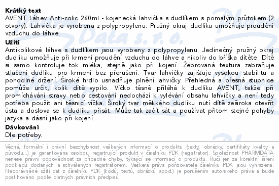 AVENT Láhev Anti-colic 260ml - kojenecká lahvička s dudlíkem s pomalým průtokem (2 otvory). Lahvička je vyrobena z polypropylenu. Pružný okraj dudlíku umožňuje proudění vzduchu do láhve.