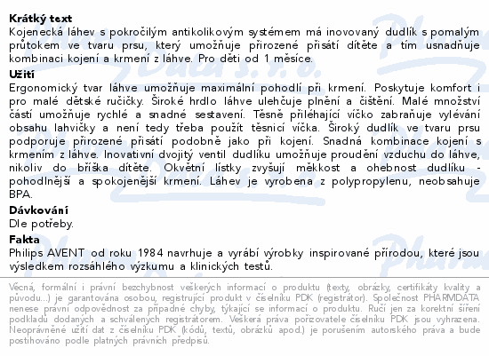 Kojenecká láhev s pokročilým antikolikovým systémem má inovovaný dudlík s pomalým průtokem ve tvaru prsu, který umožňuje přirozené přisátí dítěte a tím usnadňuje kombinaci kojení a krmení z láhve. Pro děti od 1 měsíce.