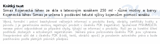 Simax Kojenecká láhev ze skla s latexovým sosákem 250 ml - různé motivy a barvy. Kojenecká láhev Simax je určena k podávání tekuté výživy kojencům pomocí sosáku.