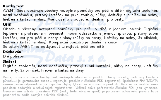 AVENT Sada obsahuje všechny nezbytné pomůcky pro péči o dítě - digitální teploměr, nosní odsávačku, prstový kartáček na první zoubky, nůžky, kleštičky a pilníček na nehty, hřeben a kartáč na vlasy. Vše uloženo v pouzdře, ideálním pro cesty.