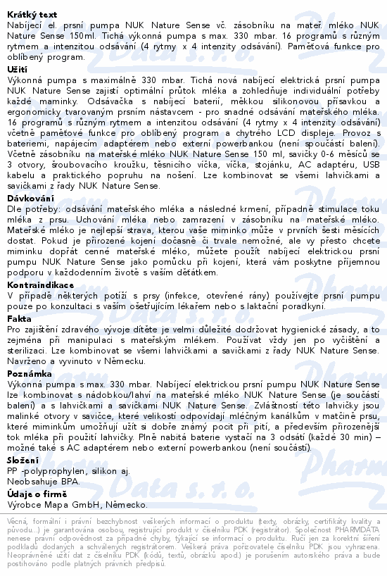 Nabíjecí el. prsní pumpa NUK Nature Sense vč. zásobníku na mateř. mléko NUK Nature Sense 150ml. Tichá výkonná pumpa s max. 330 mbar. 16 programů s různým rytmem a intenzitou odsávání (4 rytmy x 4 intenzity odsávání). Paměťová funkce pro oblíbený program.