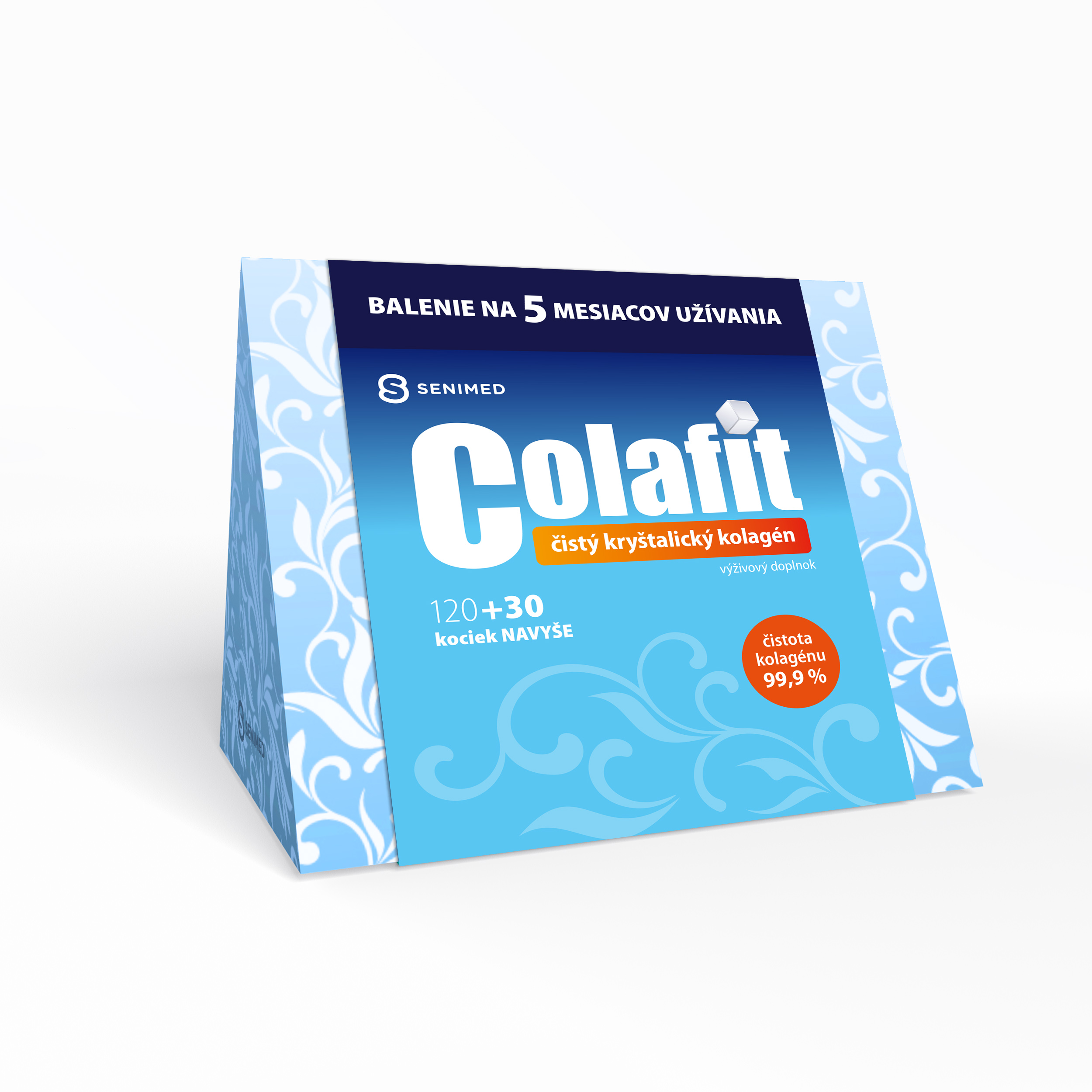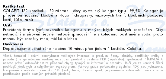 Colafit je doplněk stravy, který obsahuje čistý krystalický kolagen typu I 99,9%. Kolagen je ve vodě nerozpustná bílkovina, která je přirozenou součástí kloubů a kloubní chrupavky, vazivových tkání, kloubních pouzder, kostí, kůže, zubů. Krystalická forma kolagenu je pro organismus lépe využitelná. Nyní dárkové balení 120 + 30 kostiček navíc. Toto množství Vám vystačí na 5 měsíců užívání.