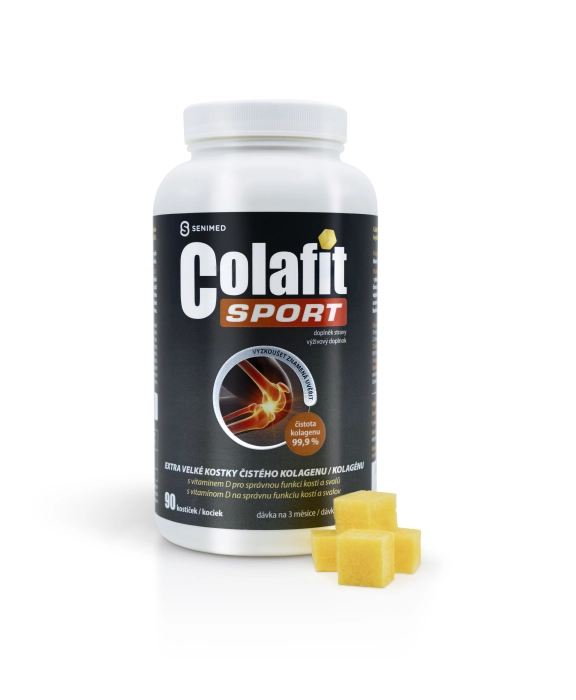 Colafit SPORT 90 kostiček je doplněk stravy s dávkou čistého kolagenu typu I, navíc s vitaminem D3. Colafit Sport - receptura obsahující nejvyšší denní dávku čistého krystalického kolagenu typu I ze všech variant Colafitu. Jedna kostička (20 mg) lyofilizovaného kolagenu odpovídá 2000 mg kolagenového gelu.