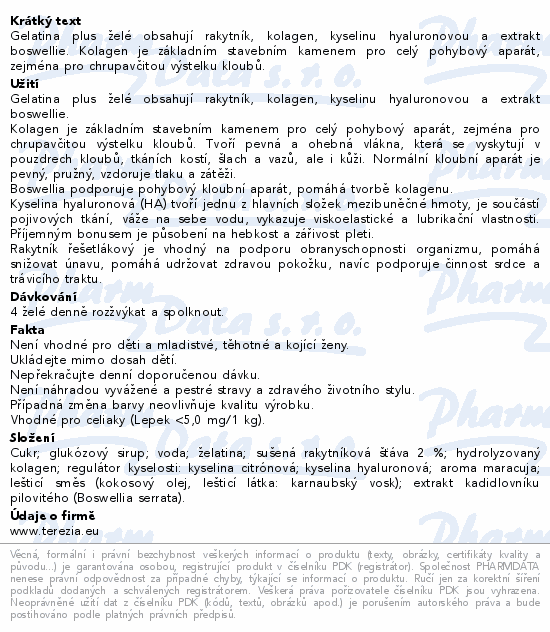 Gelatina plus želé obsahují rakytník, kolagen, kyselinu hyaluronovou a extrakt boswellie. Kolagen je základním stavebním kamenem pro celý pohybový aparát, zejména pro chrupavčitou výstelku kloubů.