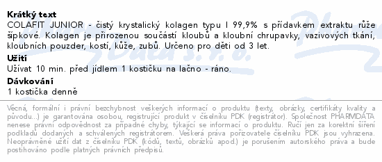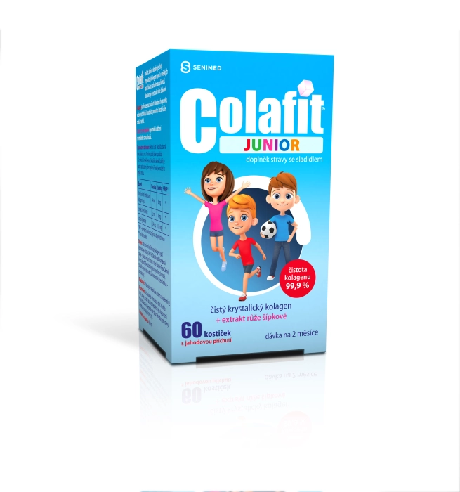 COLAFIT JUNIOR - čistý krystalický kolagen typu I 99,9% s přídavkem extraktu růže šípkové. Kolagen je přirozenou součástí kloubů a kloubní chrupavky, vazivových tkání, kloubních pouzder, kostí, kůže, zubů. Určeno pro děti od 3 let.