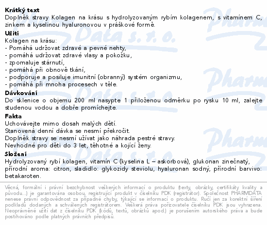 Doplněk stravy Kolagen na krásu s hydrolyzovaným rybím kolagenem, s vitamínem C, zinkem a kyselinou hyaluronovou v práškové formě.
