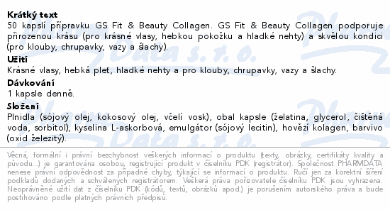 50 kapslí přípravku GS Fit & Beauty Collagen. GS Fit & Beauty Collagen podporuje přirozenou krásu (pro krásné vlasy, hebkou pokožku a hladké nehty) a skvělou kondici (pro klouby, chrupavky, vazy a šlachy).