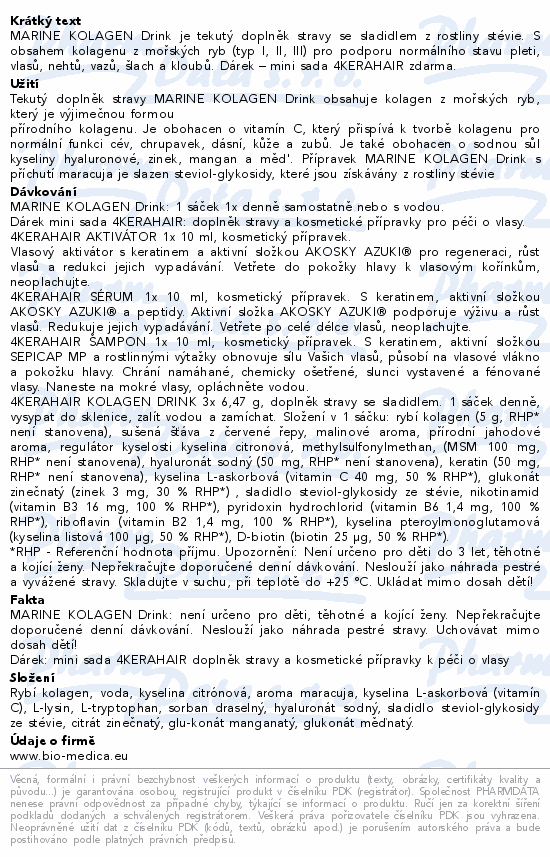 MARINE KOLAGEN Drink je tekutý doplněk stravy se sladidlem z rostliny stévie. S obsahem kolagenu z mořských ryb (typ I, II, III) pro podporu normálního stavu pleti, vlasů, nehtů, vazů, šlach a kloubů. Dárek – mini sada 4KERAHAIR zdarma.