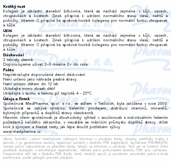 Kolagen je základní stavební bílkovina, která se nachází zejména v kůži, vazech, chrupavkách a kostech. Zinek přispívá k udržení normálního stavu vlasů, nehtů a pokožky. Vitamin C přispívá ke správné tvorbě kolagenu pro normální funkci chrupavek a kůže.