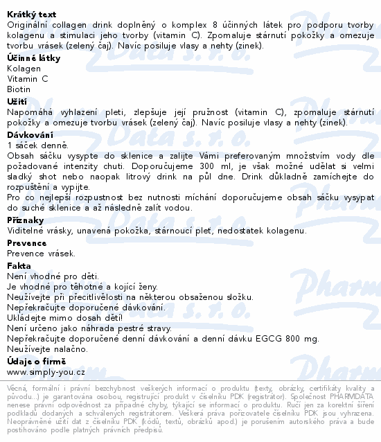 Originální collagen drink doplněný o komplex 8 účinných látek pro podporu tvorby kolagenu a stimulaci jeho tvorby (vitamin C). Zpomaluje stárnutí pokožky a omezuje tvorbu vrásek (zelený čaj). Navíc posiluje vlasy a nehty (zinek).