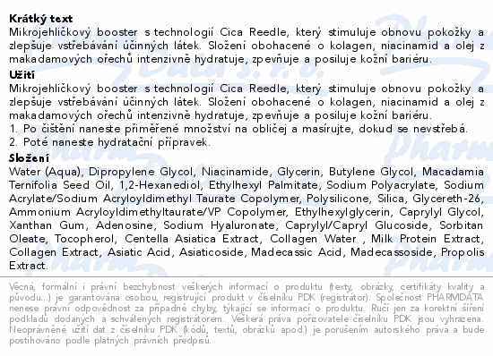Mikrojehličkový booster s technologií Cica Reedle, který stimuluje obnovu pokožky a zlepšuje vstřebávání účinných látek. Složení obohacené o kolagen, niacinamid a olej z makadamových ořechů intenzivně hydratuje, zpevňuje a posiluje kožní bariéru.