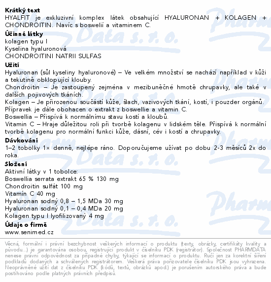 HYALFIT je exkluzivní komplex látek obsahující HYALURONAN + KOLAGEN + CHONDROITIN. Navíc s boswelií a vitaminem C. Hyaluronan ve velkém množství se nachází například v kůži a tekutině obklopující klouby Kolagen je přirozenou součástí kůže, šlach, vazivových tkání, kostí i pouzder orgánů, hraje nesmírně důležitou roli ve správném fungování celého pohybového ústrojí Chondroitin je zastoupený zejména v mezibuněčné hmotě chrupavky, ale také v dalších pojivových tkáních. Hyalfit je unikátní přípravek obsahující 3-komplex látek pro zdravou pleť, vlasy, nehty a klouby.