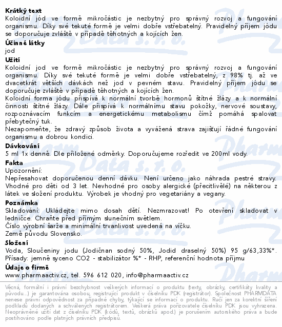 Koloidní jód ve formě mikročástic je nezbytný pro správný rozvoj a fungování organismu. Díky své tekuté formě je velmi dobře vstřebatelný. Pravidelný příjem jódu se doporučuje zvláště v případě těhotných a kojících žen.