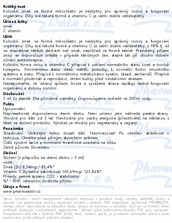 Koloidní zinek ve formě mikročástic je nezbytný pro správný rozvoj a fungování organismu. Díky své tekuté formě a vitamínu C je velmi dobře vstřebatelný.