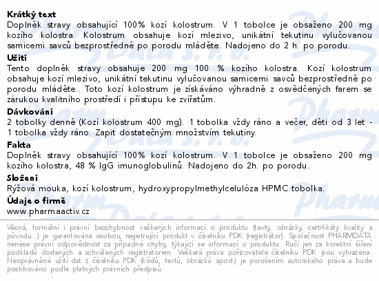 Doplněk stravy obsahující 100% kozí kolostrum. V 1 tobolce je obsaženo 200 mg kozího kolostra. Kolostrum obsahuje kozí mlezivo, unikátní tekutinu vylučovanou samicemi savců bezprostředně po porodu mláděte. Nadojeno do 2 h. po porodu.