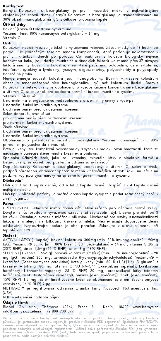Barny´s Kolostrum s beta-glukany je první mateřské mléko z nejkvalitnějších ekologických chovů skotu. Barny´s Kolostrum s beta-glukany je standardizováno na 30% obsah imunoglobulinů IgG z celkového obsahu kapsle.