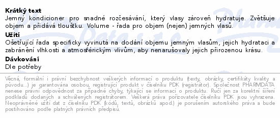 Jemný kondicioner pro snadné rozčesávání, který vlasy zároveň hydratuje. Zvětšuje objem a přidává tloušťku. Volume - řada pro objem (nejen) jemných vlasů.