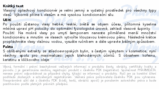 Vlasový oplachový kondicionér je velmi jemný a vydatný prostředek pro všechny typy vlasů. Výborně přilne k vlasům a má vysokou kondicionační sílu.