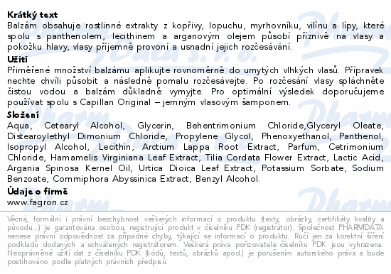 Balzám obsahuje rostlinné extrakty z kopřivy, lopuchu, myrhovníku, vilínu a lípy, které spolu s panthenolem, lecithinem a arganovým olejem působí příznivě na vlasy a pokožku hlavy, vlasy příjemně provoní a usnadní jejich rozčesávání.
