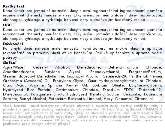 Kondicionér pro jemné až normální vlasy s osmi regeneračními ingrediencemi pomáhá regenerovat chemicky narušené vlasy. Díky svému jemnému složení vlasy nepoškozuje, ale naopak vyhlazuje a hydratuje barvené vlasy a dodává jim hedvábný vzhled.