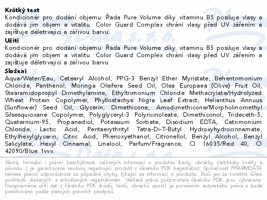 Kondicionér pro dodání objemu. Řada Pure Volume díky vitaminu B5 posiluje vlasy a dodává jim objem a vitalitu. Color Guard Complex chrání vlasy před UV zářením a zajišťuje déletrvající a zářivou barvu.