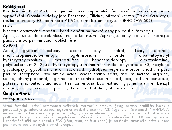 Kondicionér NAVLASIL pro jemné vlasy napomáhá růst vlasů a zabraňuje jejich vypadávání. Obsahuje složky jako Panthenol, Tilicine, přírodní keratin (Fision Kera Veg), rostlinné proteiny (Gluadin Kera P-LM) a komplex aminokyselin (PRODEW 500).