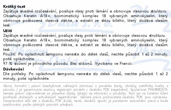 Zajišťuje snadné rozčesávání, posiluje vlasy proti lámání a obnovuje vlasovou strukturu. Obsahuje Keratin A18+, biomimetický komplex 18 vybraných aminokyselin, který obnovuje poškozená vlasová vlákna, a extrakt ze slézu bílého, který dodává vlasům lesk.