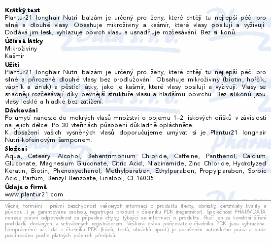 Plantur21 longhair Nutri balzám je určený pro ženy, které chtějí tu nejlepší péči pro silné a dlouhé vlasy. Obsahuje mikroživiny a kašmír, které vlasy posilují a vyživují. Dodává jim lesk, vyhlazuje povrch vlasu a usnadňuje rozčesávání. Bez silikonů.