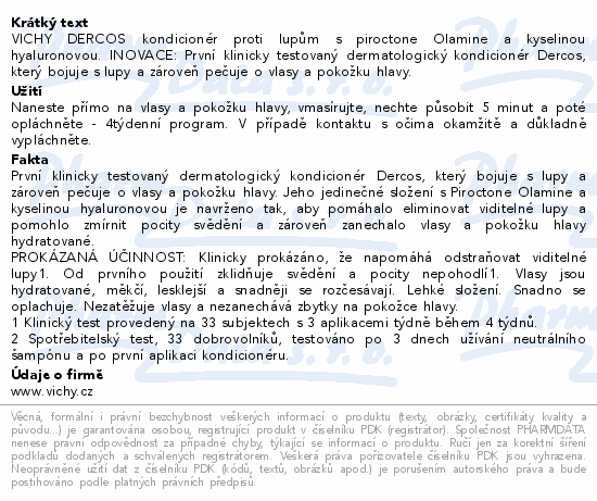 - INOVACE: První klinicky testovaný dermatologický kondicionér Dercos, který bojuje s lupy a zároveň pečuje o vlasy a pokožku hlavy. Jeho jedinečné složení s Piroctone Olamine a kyselinou hyaluronovou je navrženo tak, aby pomáhalo eliminovat viditelné lupy a pomohlo zmírnit pocity svědění a zároveň zanechalo vlasy a pokožku hlavy hydratované. Pomáhá eliminovat viditelné lupy a zmínit pocity svědění a zanechá vlasy a pokožku hlavy hydratovanou