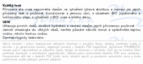 Přirozená síla ovsa napomáhá vlasům ve vytváření zdravé struktury a navrací jim jejich přirozený lesk a pružnost. Kondicionér s jemnou vůní, s obsahem BIO jojobového a kokosového oleje, s výtažkem z BIO ovsa a bílého slézu.