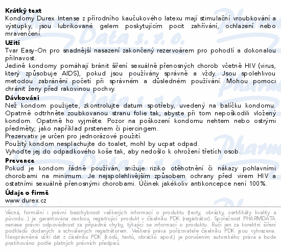 Kondomy Durex Intense z přírodního kaučukového latexu mají stimulační vroubkování a výstupky, jsou lubrikované gelem poskytujícím pocit zahřívání, ochlazení nebo mravenčení.