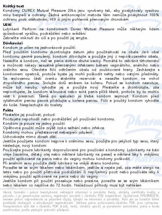 Kondomy DUREX Mutual Pleasure 20ks jsou vyrobeny tak, aby poskytovaly vysokou míru bezpečí a ochrany. Žádná antikoncepční metoda Vám nemůže poskytnout 100% ochranu proti otěhotnění, HIV či jiným pohlavně přenosným chorobám.