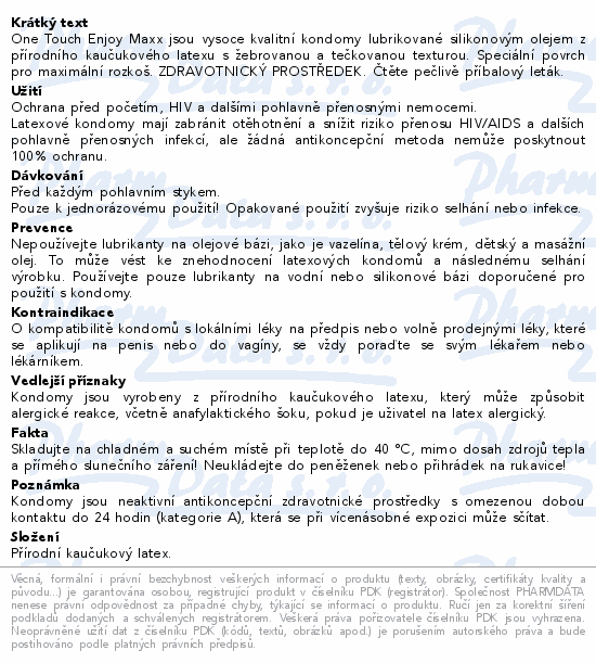 One Touch Enjoy Maxx jsou vysoce kvalitní kondomy lubrikované silikonovým olejem z přírodního kaučukového latexu s žebrovanou a tečkovanou texturou. Speciální povrch pro maximální rozkoš. ZDRAVOTNICKÝ PROSTŘEDEK. Čtěte pečlivě příbalový leták.