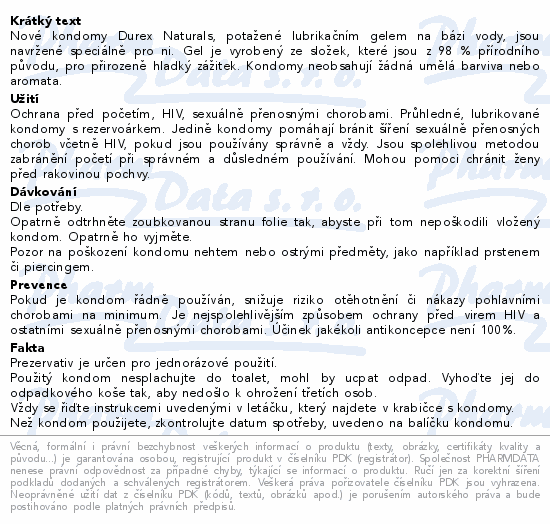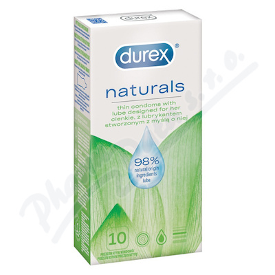 Nové kondomy Durex Naturals, potažené lubrikačním gelem na bázi vody, jsou navržené speciálně pro ni. Gel je vyrobený ze složek, které jsou z 98 % přírodního původu, pro přirozeně hladký zážitek. Kondomy neobsahují žádná umělá barviva nebo aromata.