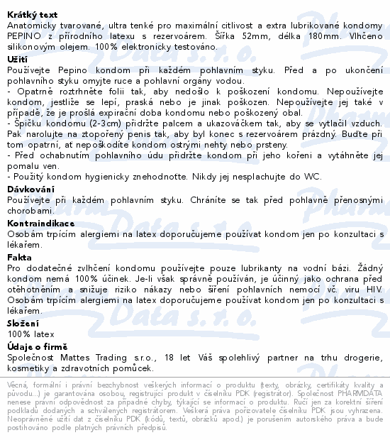Anatomicky tvarované, ultra tenké pro maximální citlivost a extra lubrikované kondomy PEPINO z přírodního latexu s rezervoárem. Šířka 52mm, délka 180mm. Vlhčeno silikonovým olejem. 100% elektronicky testováno.