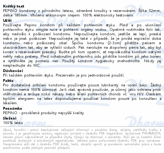 PEPINO kondomy z přírodního latexu, zdrsněné kroužky s rezervoárem. Šířka 52mm, délka 180mm. Vlhčeno silikonovým olejem. 100% elektronicky testováno.