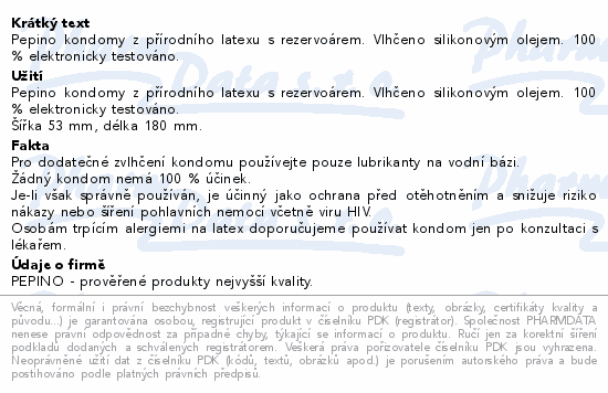 PEPINO kondomy z přírodního latexu s rezervoárem. Šířka 53mm, délka 180mm. Vlhčeno silikonovým olejem.100% elektronicky testováno.